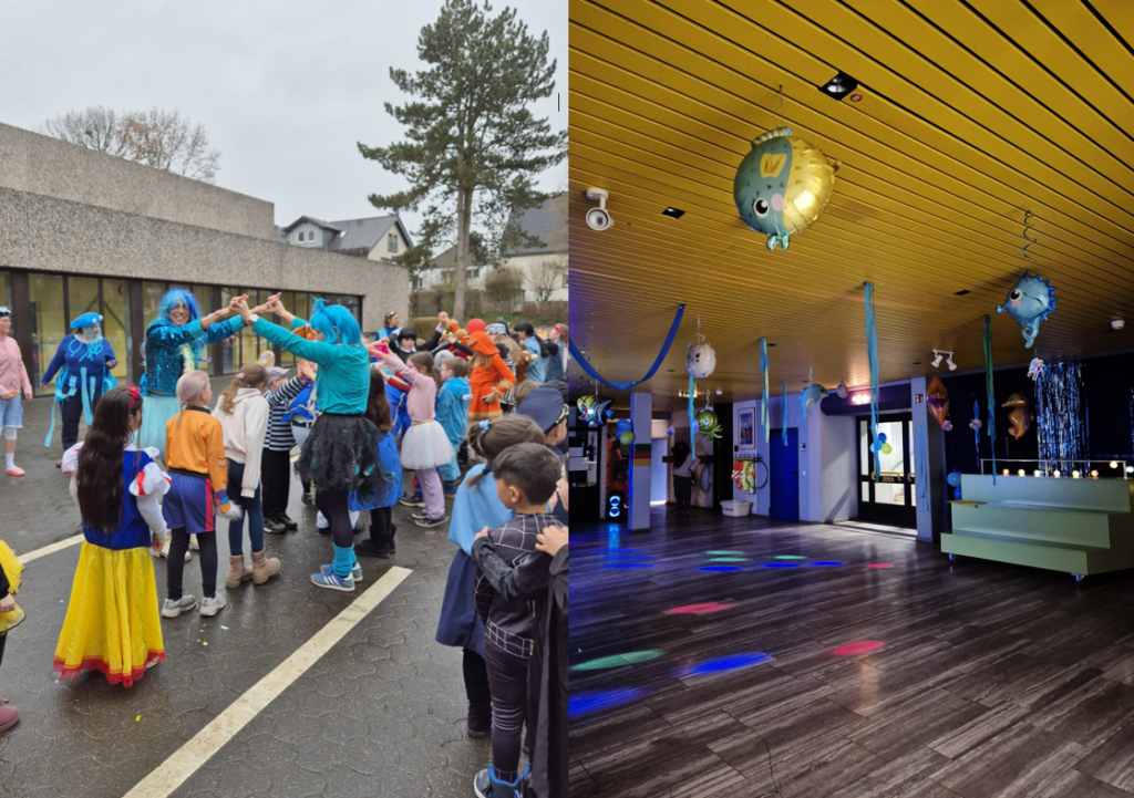 An unserem Karnevalsdonnerstag verwandelte sich das Schulgebäude in einen Ort voller Lebensfreude. Das allgemeine Motto hieß „Unter Wasser“ und so war die Eingangshalle liebevoll mit allerlei Meerestieren geschmückt.