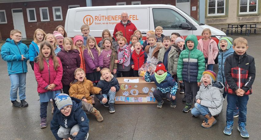 Einer schönen Tradition folgend durften die Kinder der Eulenklasse aus dem 1. Jahrgang der Grundschule in Mellrich an die Tafel Rüthen eine große Sachspende überreichen.